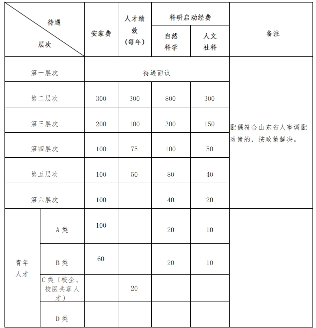 (一)各类引进人才除享受国家及学校规定的基本工资待遇外,学校在安家费、科研启动经费等方面提供以下待遇。(人民币,单位:万元)