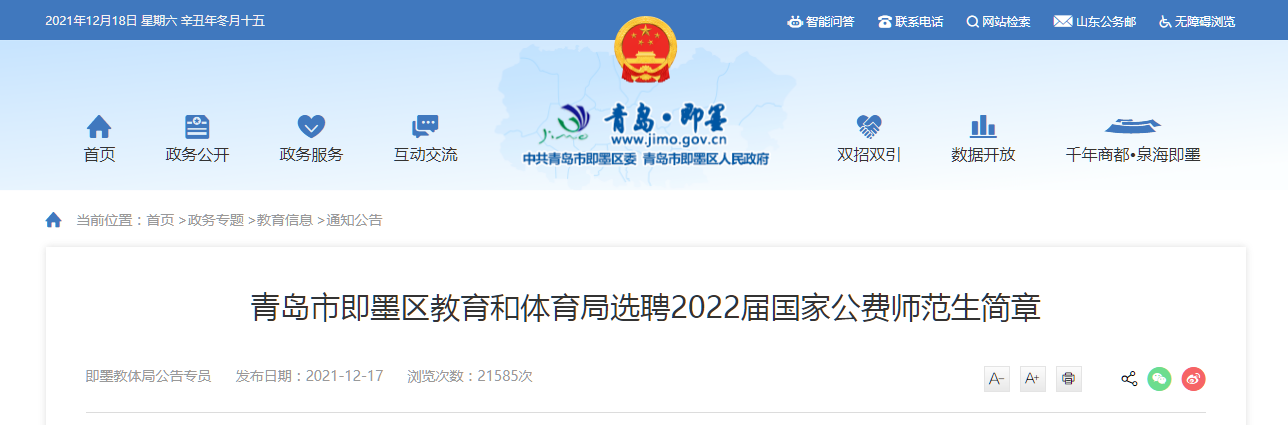 青岛市即墨区教育和体育局选聘2022届国家公费师范生简章 2021-12-18