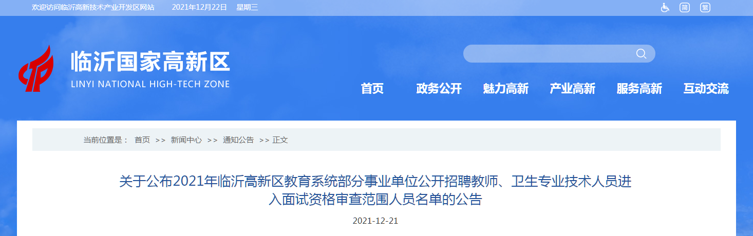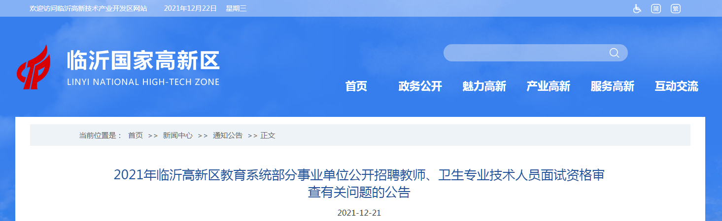 2021年临沂高新区教育系统部分事业单位公开招聘教师、卫生专业技术人员面试资格审查有关问题的公告 2021-12-22