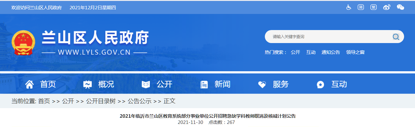 2021年临沂市兰山区教育系统部分事业单位公开招聘急缺学科教师取消及核减计划公告 2021-12-02