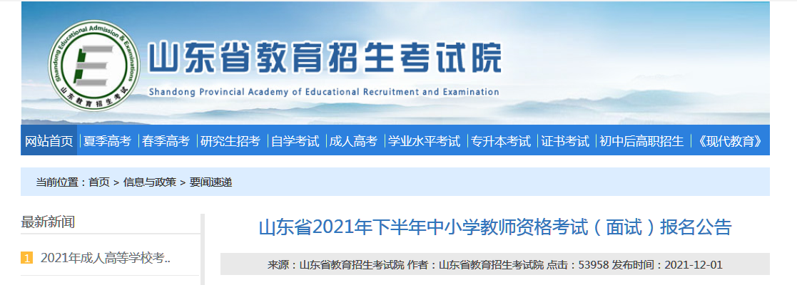山东省2021年下半年中小学教师资格考试(面试)报名公告 2021-12-02