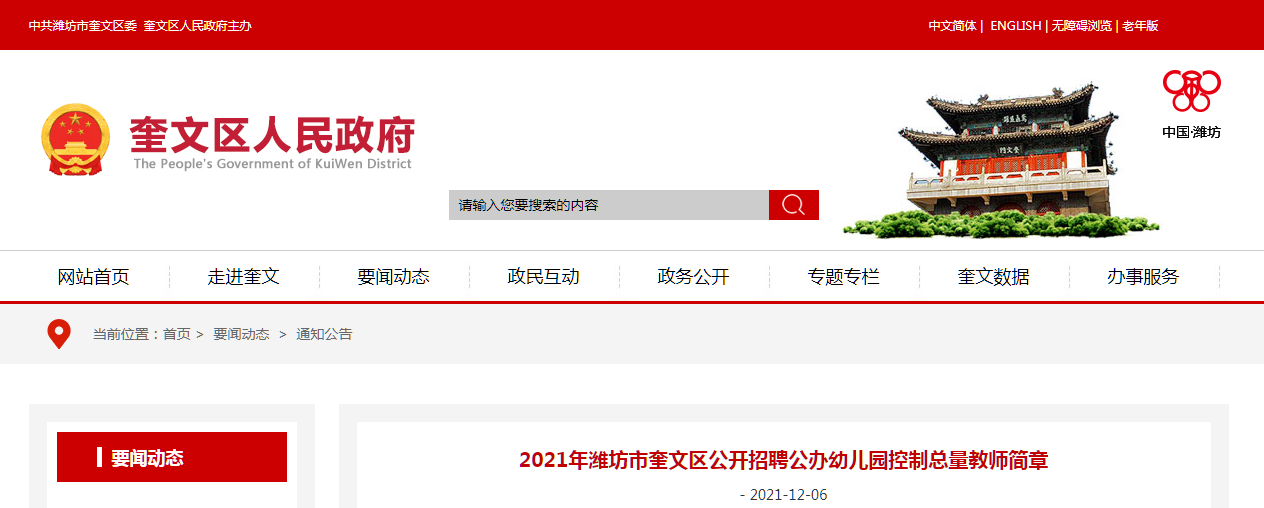 2021年潍坊市奎文区公开招聘公办幼儿园控制总量教师简章(36人) 2021-12-07
