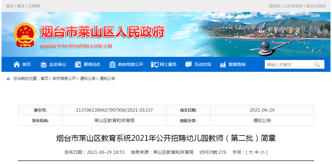 2021年烟台市莱山区教育系统招聘幼儿园教师(第二批)简章职位表(40人) 2021-06-30