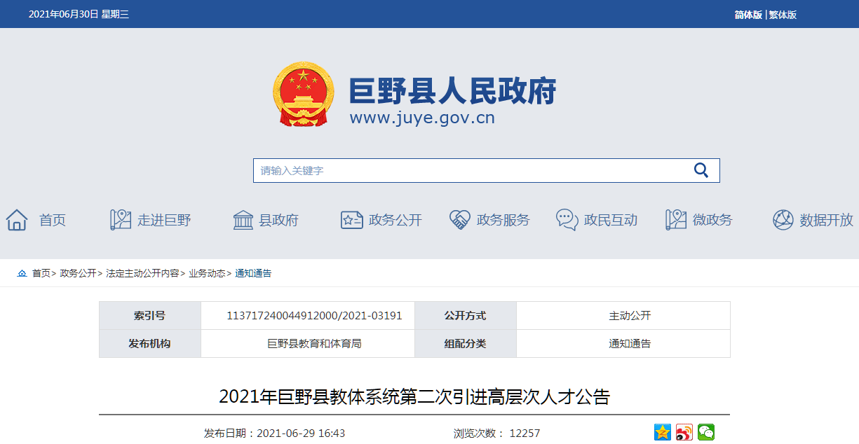 2021年菏泽巨野县教体系统第二次引进高层次人才公告(149人) 2021-06-30